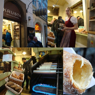 Nesta padaria, como se vê no painel tridimensional pendurado à porta, é feito o tradicional trdelník, pãozinho em forma de bracelete, que normalmente é servido com açúcar e canela.